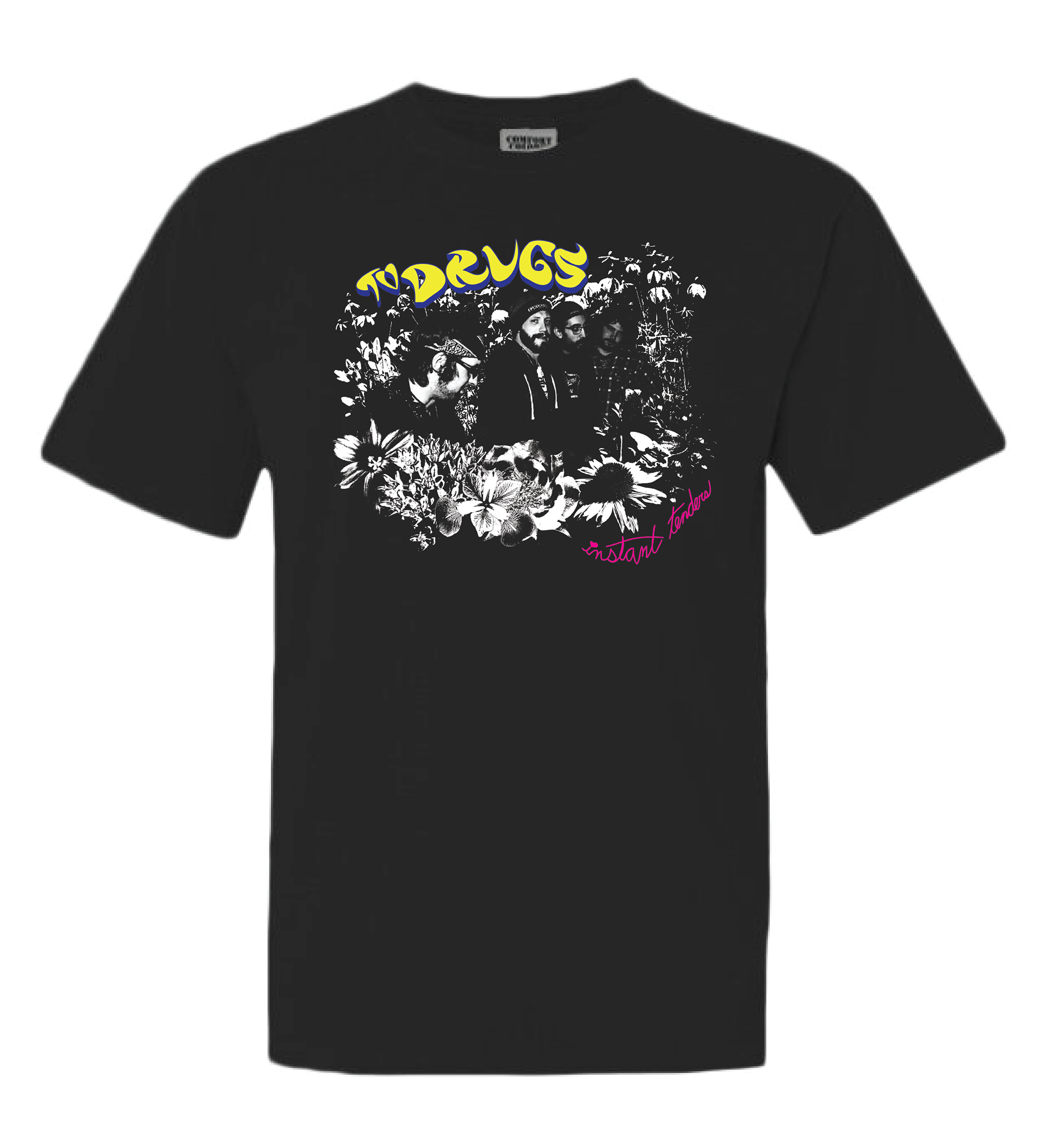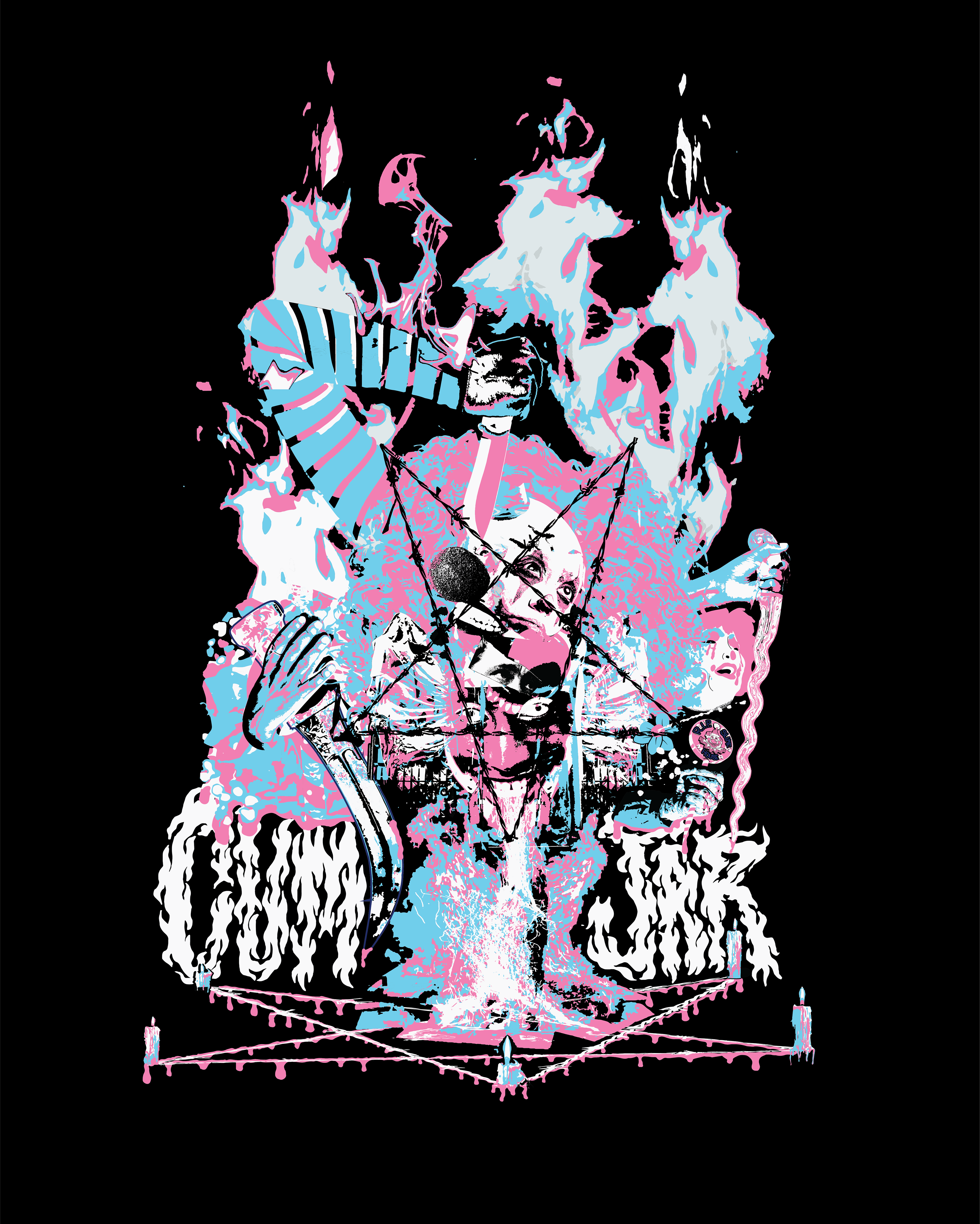 A collection of band/music related merchandise design, including shirts, a poster, and cassette sticker and j-card layouts.